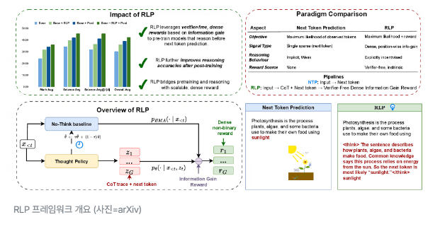이 방식은 외부 검증자나 인간 없이도 모델이 스스로 유용한 사고 패턴을 익히는 RL을 가능하게 만든다. 연구진은 “RLP는 모델이 다음 단어를 예측하기 전에 먼저 스스로 생각하도록 유도함으로써, 사전 훈련 단계에서부터 독립적인 사고 행위를 가르친다”라고 설명했다.