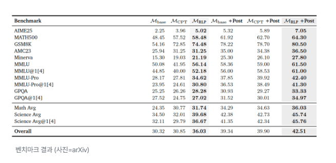 또 “RLP는 RLHF나 SFT흫 대체하기 위한 것이 아니라, 이후 학습 단계를 더 효과적으로 만드는 기반 기술”이라며, 추가로 사후 훈련하는 것이 여전히 필요하다고 덧붙였다.