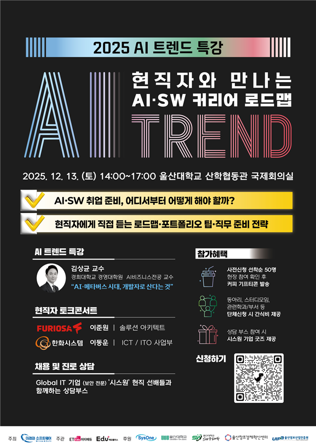 라. | 세부내용 | : | AI 트렌드 특강 - 김상균 교수(경희대) 현직자 토크콘서트 - 퓨리오사AI, 한화시스템 ICT 현직자 토크콘서트 채용 & 진로 상담 - Global IT기업 ‘시스원’ 현직 선배와의 1:1 상담 |