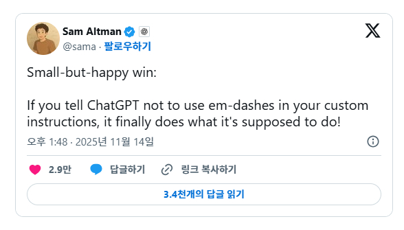 샘 알트먼 오픈AI의 CEO는 14일(현지시간) X(트위터)를 통해 “사용자가 커스텀 지침(custom instructions)에서 엠 대시를 쓰지 말라고 요청하면 이제 제대로 작동한다”라고 밝혔다. “작지만 기쁜 개선”이라고 덧붙였다.